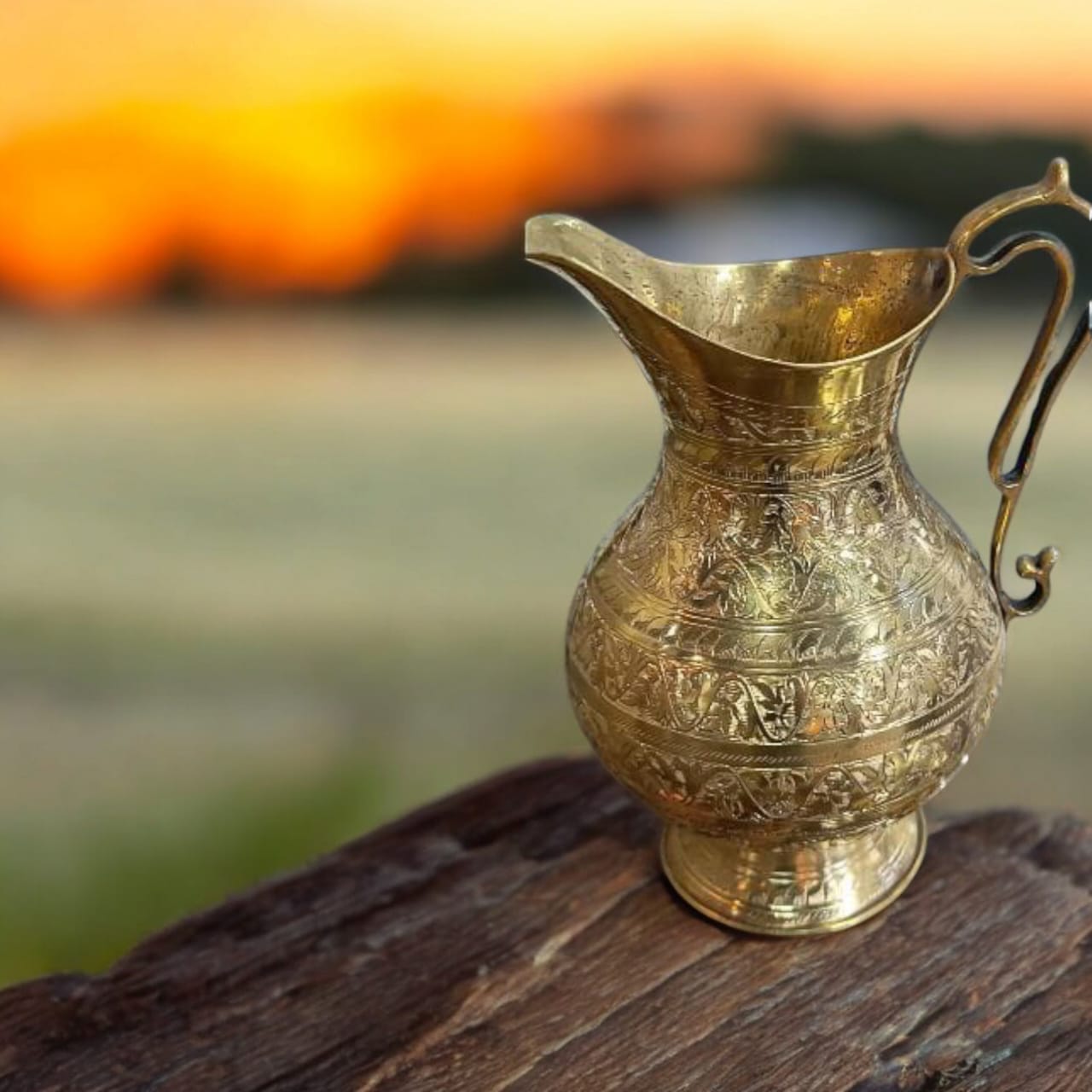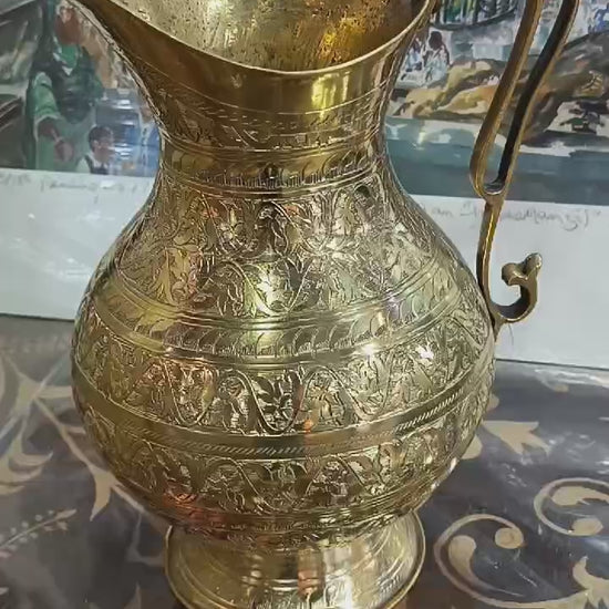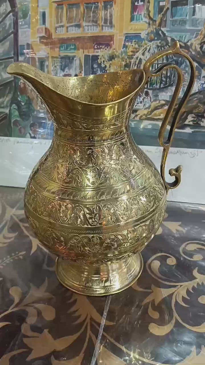 This Antique Handmade Brass Jug combines vintage charm with intricate craftsmanship. Adorned with delicate floral engravings, its warm golden hue and elegant silhouette make it a stunning decor piece. The curving handle and detailed patterns reflect timeless artistry, perfect for adding a touch of luxury to any space.