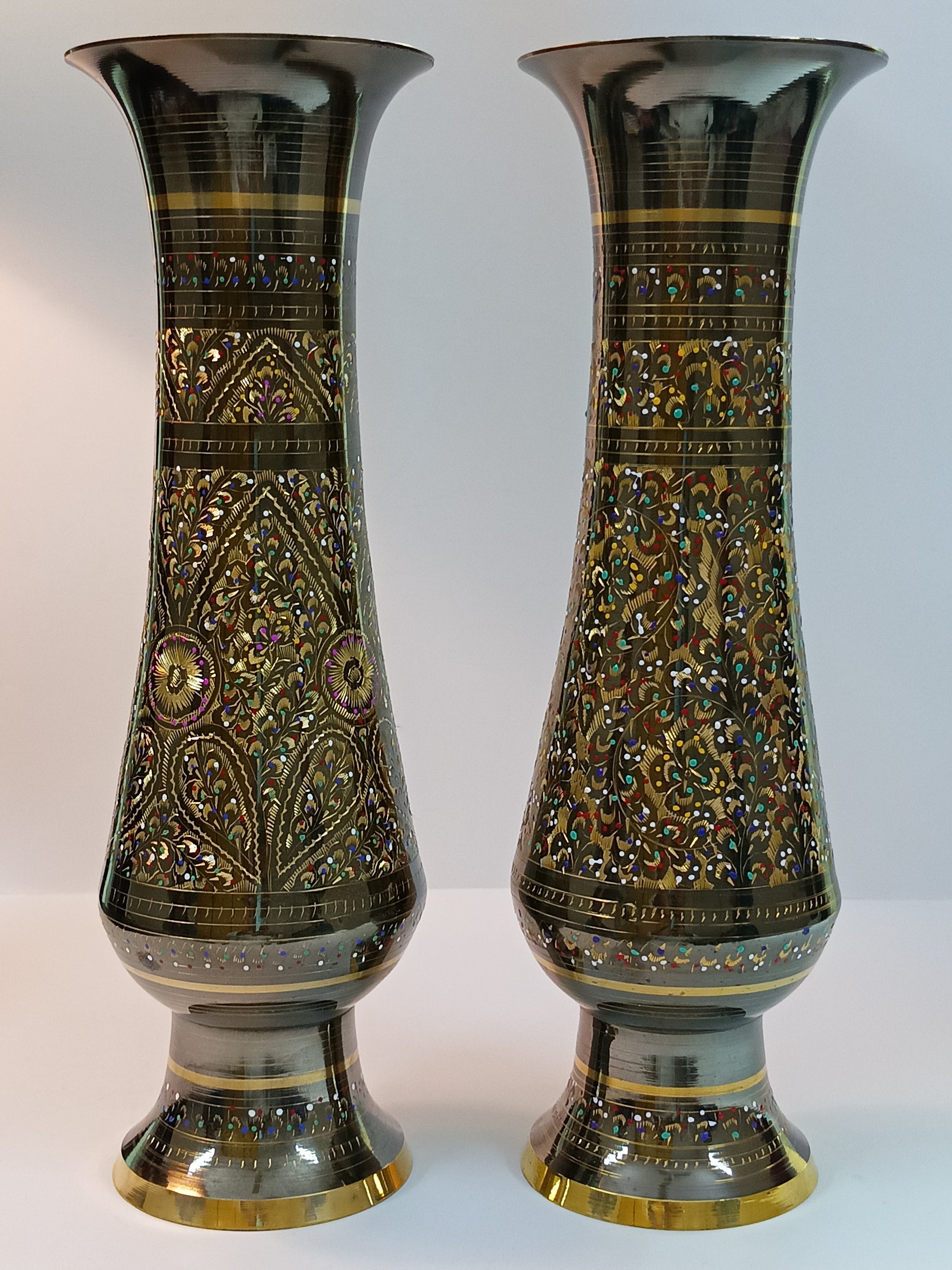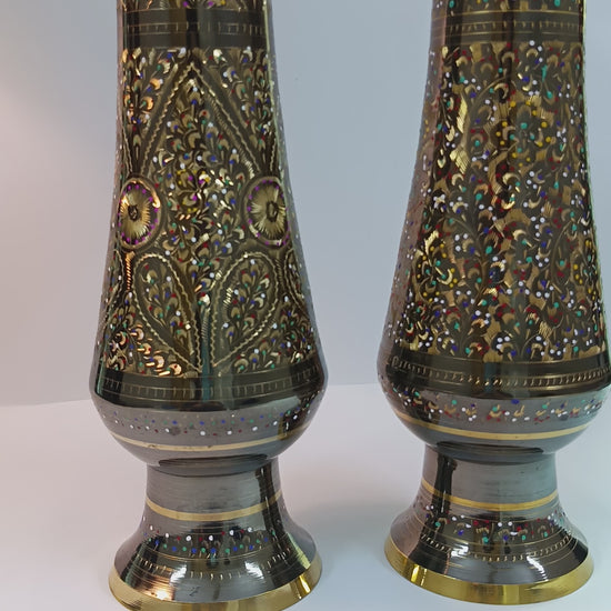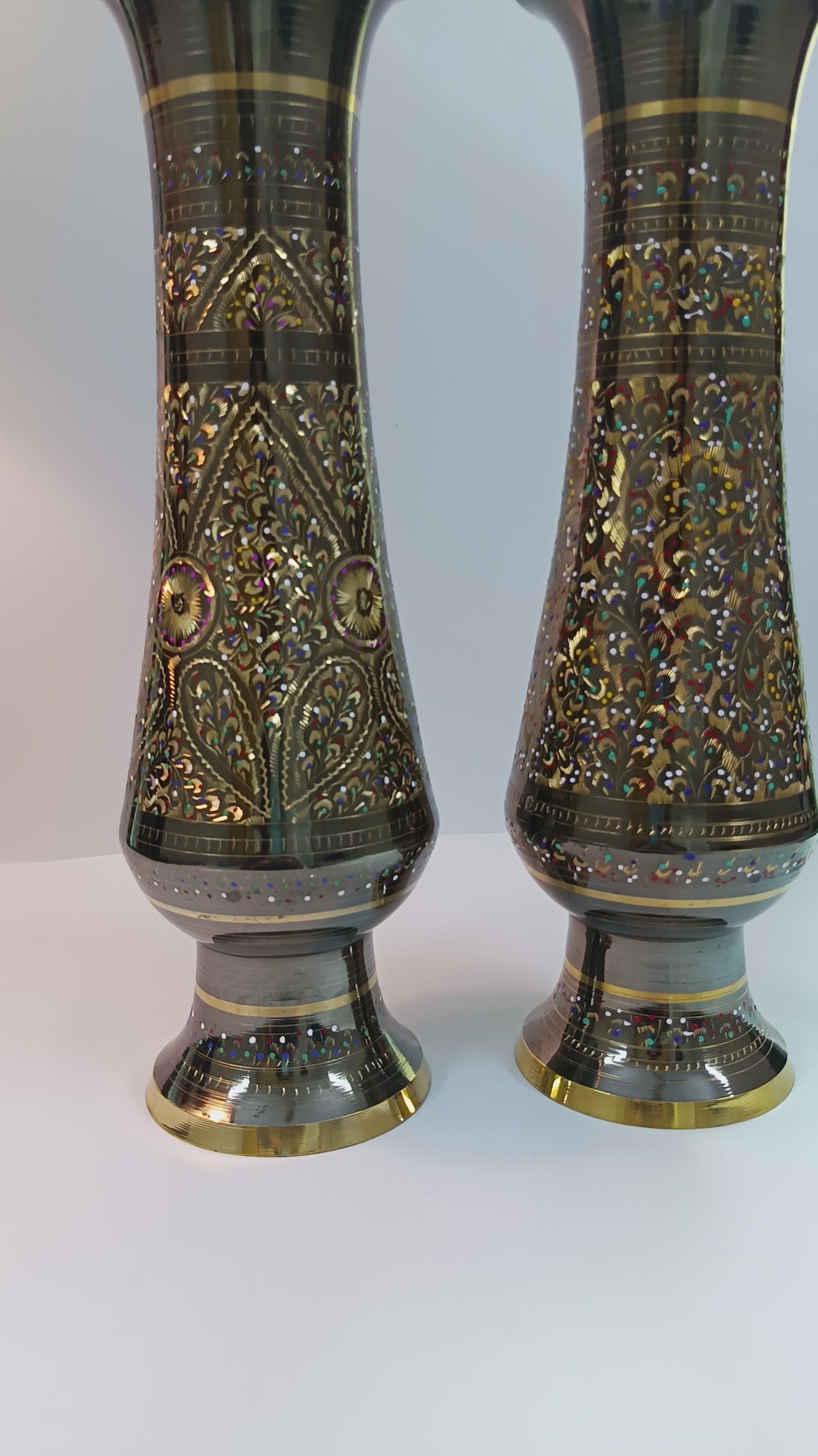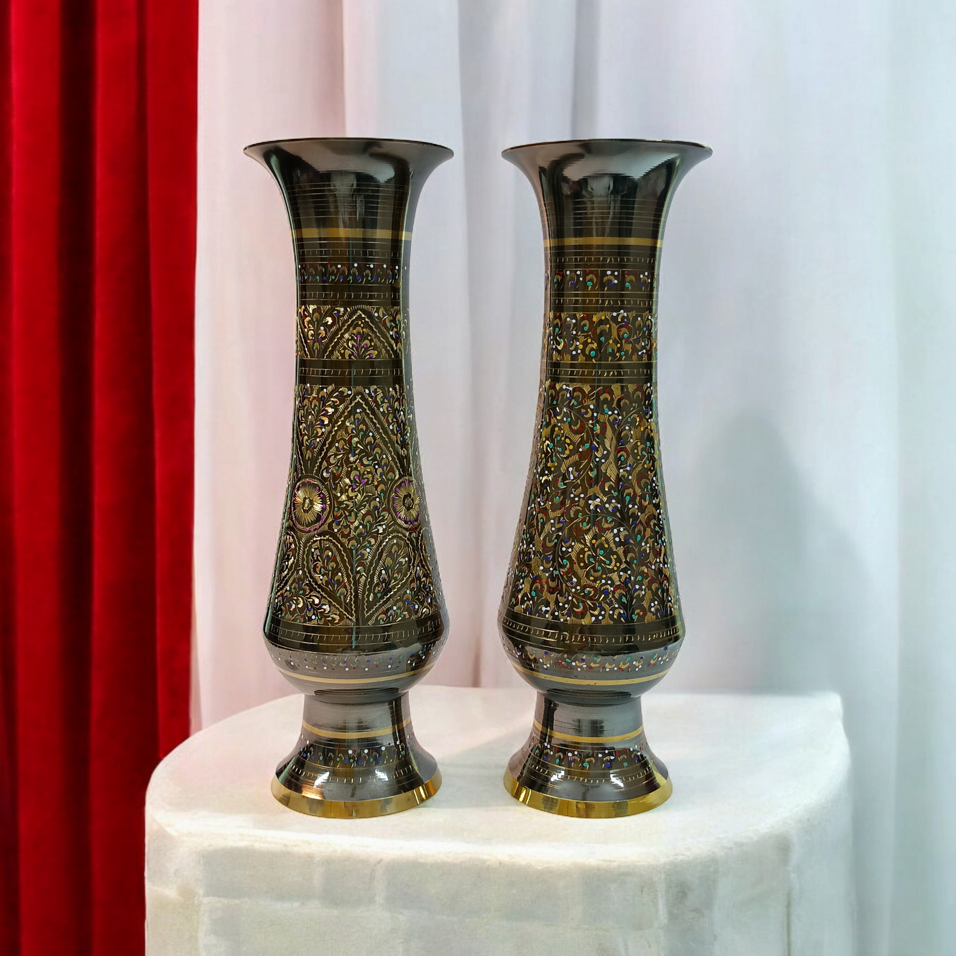 This Handmade Brass Vase set 13.5 inches height combines vintage charm with intricate craftsmanship. Adorned with delicate floral engravings, its colorful