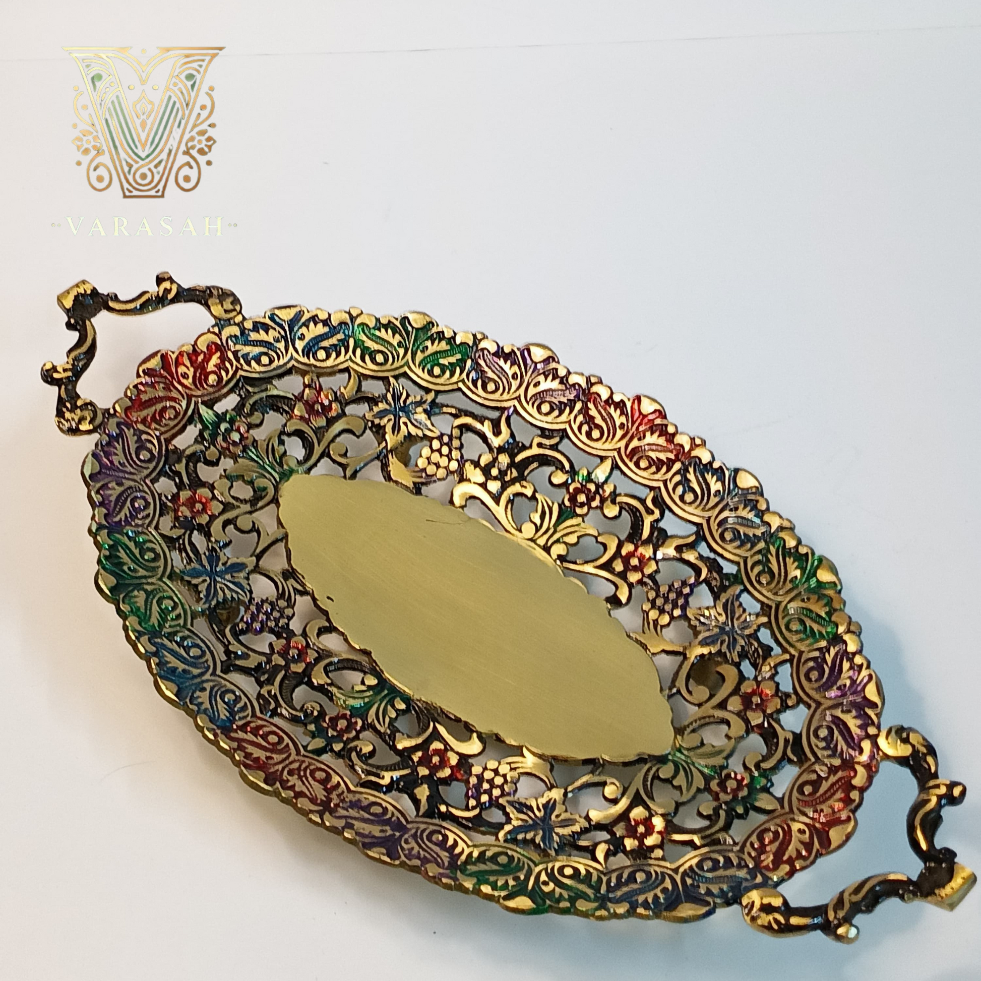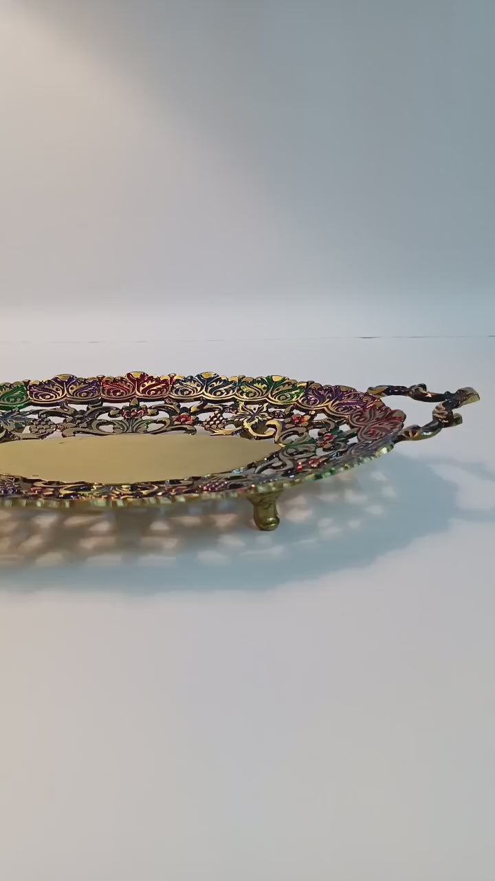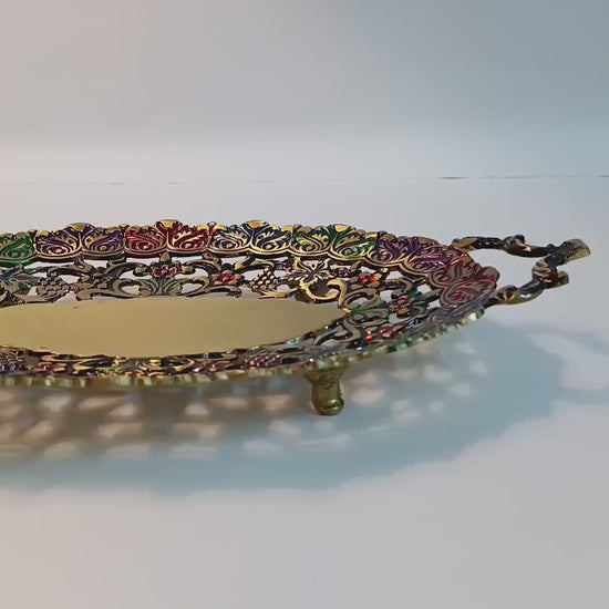 his is an ornate decorative brass tray with intricate metalwork and a vibrant, multicolored design. The tray features a gold-toned finish with an elaborate lace-like pattern around the edges, incorporating floral and leaf motifs. It is elevated on small legs for a refined appearance and includes sturdy handles on each side, enhancing its functionality. Perfect for serving or as a centerpiece, this tray adds an elegant and vintage-inspired touch to any setting.